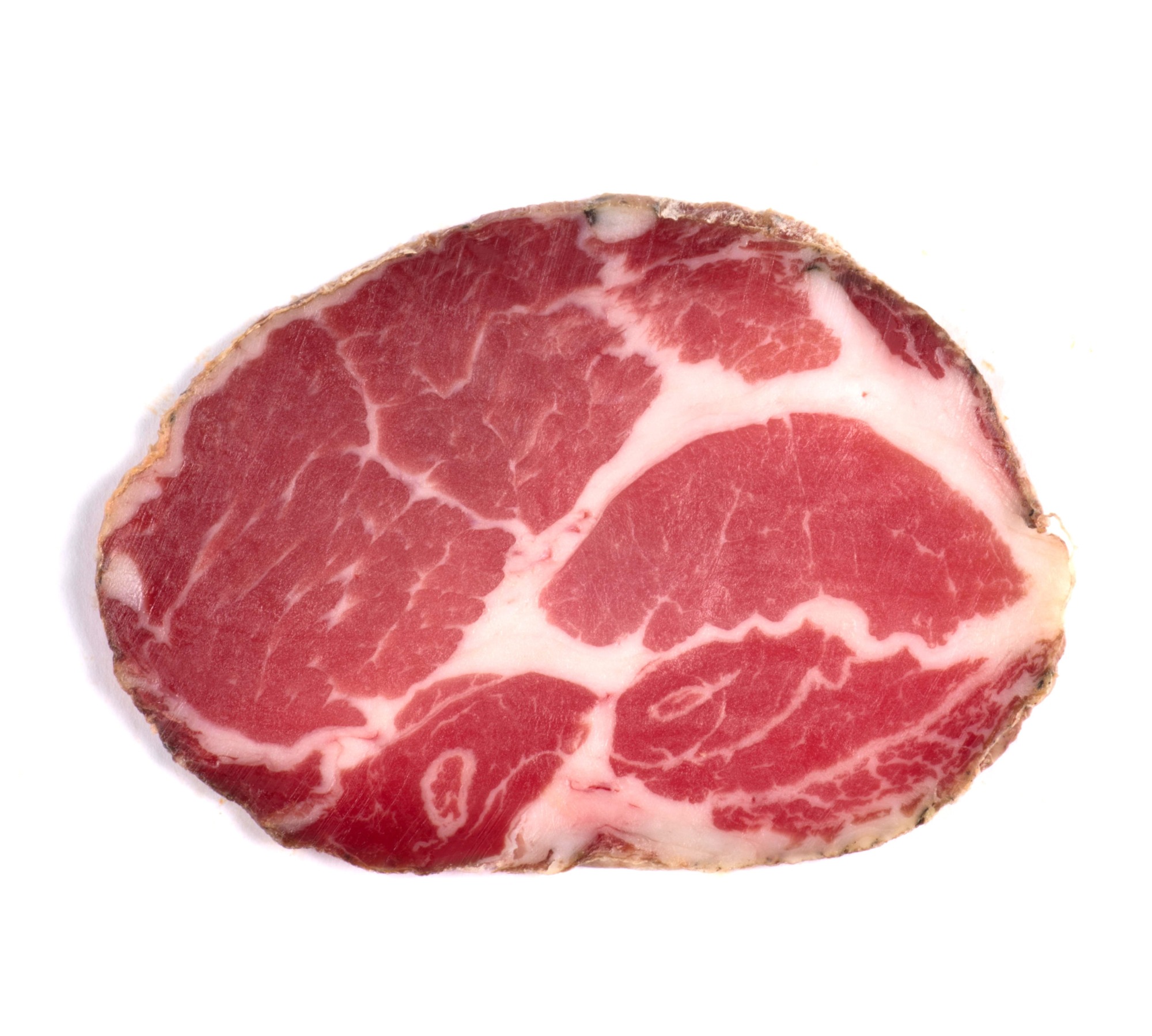 Coppa stagionata to dojrzewająca karkówka wieprzowa. Mięso natarte solą i ziołami dojrzewa przez 4/6 miesięcy, co wpływa na delikatność i jakość tej włoskiej wędliny, nadając jej niepowtarzalny smak i aromat. Coppa stagionata jest idealna do przygotowywania przystawek i dań na zimno, takich jak carpaccio, sałatki i deski wędlin. Doskonale sprawdzi się również jako składnik dań gorących, jak sosy, risotto i zapiekane makarony. Pochodzi z regionu Emilia-Romania we Włoszech. -
